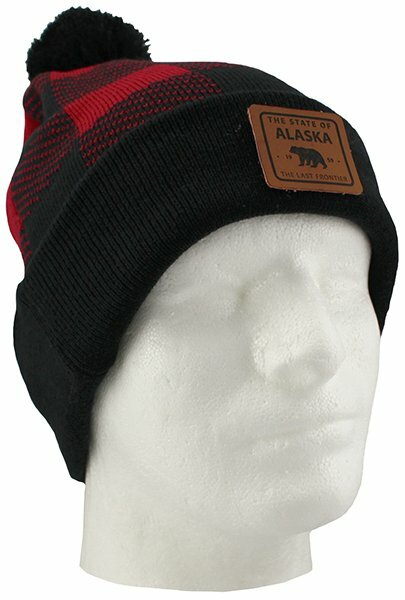 Knit hat with folded cuff, pom pom, woven buffalo plaid pattern, and debossed faux leather patch featuring our Alaskan Outdoors Bear design.